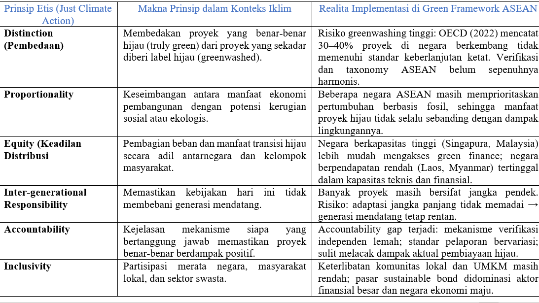 Tabel tersebut menunjukkan kesenjangan antara prinsip etis Just Climate Action dan realita implementasi Green Framework ASEAN. Prinsip distinction, yakni pembedaan antara proyek yang benar-benar hijau dan yang berpotensi greenwashing, belum sepenuhnya terpenuhi terlihat dari temuan OECD (2022) bahwa 30–40% proyek hijau di negara berkembang tidak memenuhi standar keberlanjutan ketat. Prinsip proportionality, yang menuntut keseimbangan antara manfaat ekonomi dan dampak lingkungan, juga menghadapi tantangan karena sebagian negara ASEAN masih mengandalkan energi fosil sebagai penopang pertumbuhan (Zhang & Chen, 2021). Sementara itu, prinsip equity menyoroti ketimpangan kapasitas, di mana negara berpendapatan tinggi seperti Singapura dan Malaysia lebih mudah mengakses pembiayaan hijau dibanding Laos atau Myanmar (Klinsky & Winkler, 2018). Tantangan serupa muncul pada prinsip inter-generational responsibility, karena banyak proyek masih berorientasi jangka pendek dan belum menjamin ketahanan iklim masa depan (Puaschunder, 2021). Selain itu, adanya accountability gap ditandai dengan lemahnya mekanisme verifikasi independen dan standar pelaporan membuat efektivitas proyek sulit diukur secara objektif (ADB, 2024). Terakhir, prinsip inclusivity belum sepenuhnya tercapai karena pasar hijau ASEAN+3 didominasi oleh negara ekonomi besar, sementara partisipasi negara kecil dan masyarakat lokal masih terbatas (Camargo & Mohan, 2020). Terlihat bahwa Green Framework ASEAN tidak hanya menghadapi masalah teknis, tetapi juga persoalan keadilan dan tata kelola. Oleh karena itu, jika ingin berfungsi sebagai strategi regional yang benar-benar mendukung transisi hijau dan memperkuat ketahanan iklim, kerangka ini harus mampu menjembatani kesenjangan antara prinsip ideal dan praktik lapangan di Asia Tenggara.